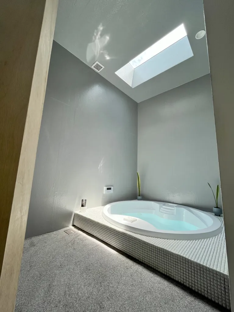 さらに、この物件には天窓が付いたジャグジーがあり、晴れた日には空を見上げながらリラックスできる贅沢なバス空間が広がっています。バスルームの天窓から差し込む自然光は、心も身体もリフレッシュさせてくれます。