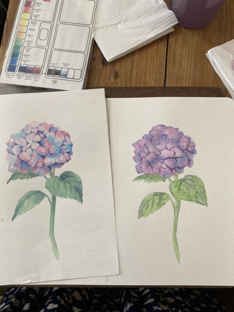紫陽花の下絵は先生のもので色を調合し、載せていくだけです。